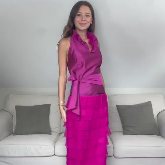 se ata con un nudo al cuello y una cremallera en un costado