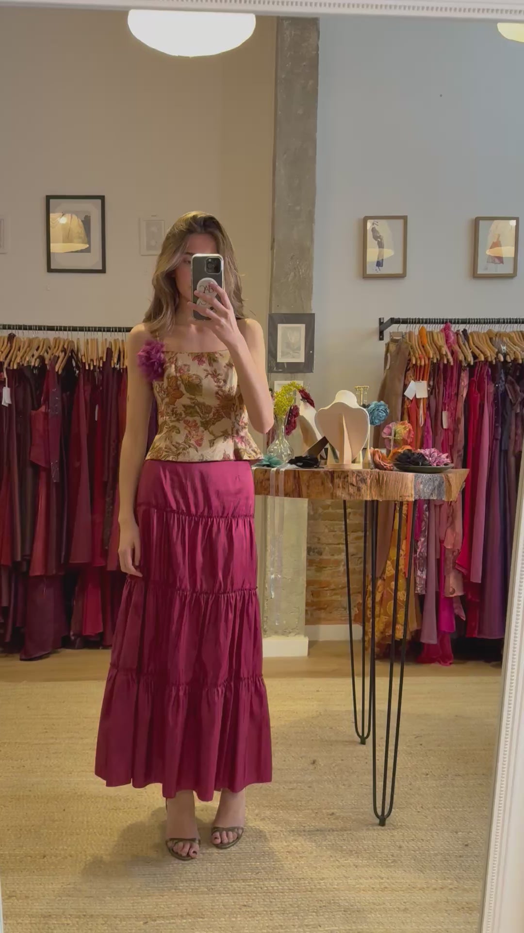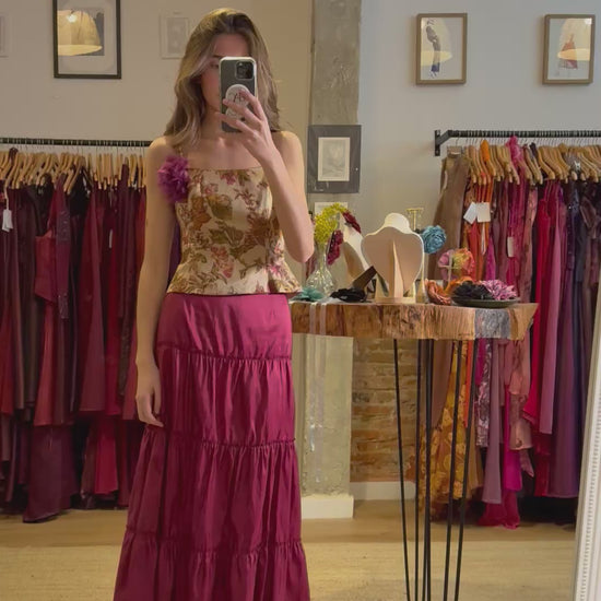 Conjunto vintage único y elegante, compuesto por top de tirantes con estampado floral sobre fondo beige, adornado con una delicada flor en el hombro, y falda en tono burdeos con volumen y caída fluida.