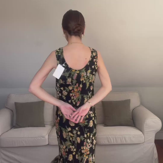 Vestido midi confeccionado en tejido ligero con fondo negro y estampado floral multicolor. Tiene escote drapeado y tirantes anchos.