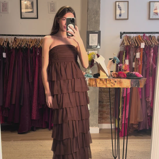 El cuerpo ajustado da paso a una falda larga formada por capas de volantes que aportan volumen, ligereza y un movimiento muy especial al caminar. Su tono marrón profundo lo convierte en una pieza elegante y diferente, perfecta para invitadas que buscan un look con personalidad.