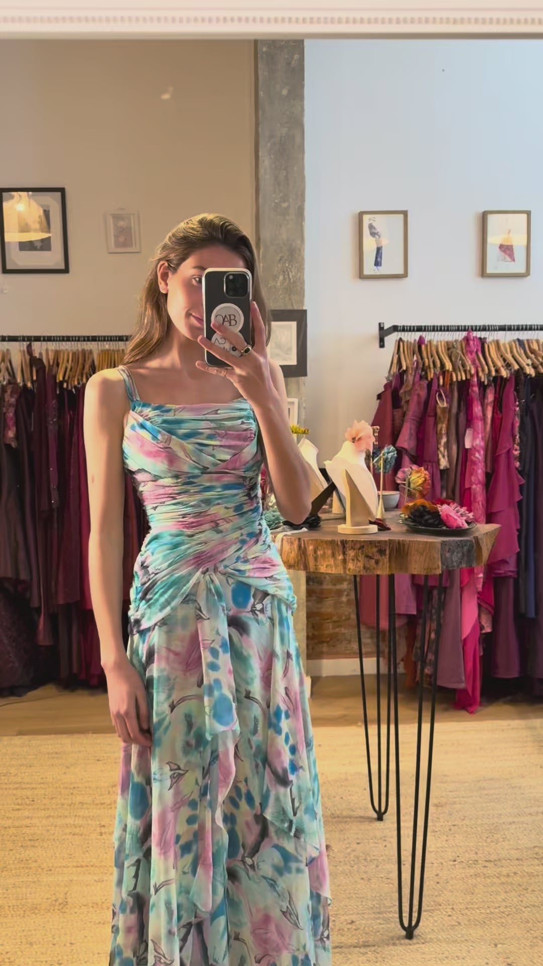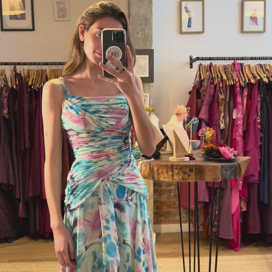 Vestido largo de tirantes finos con estampado floral en tonos turquesa, rosa y lila. Presenta un cuerpo fruncido que estiliza la silueta y una falda fluida con capas asimétricas que aportan movimiento y ligereza. Ideal para invitadas que buscan un look romántico y diferente