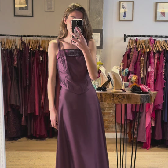 Conjunto de tres piezas en tono ciruela elaborado en tejido satinado con ligera estructura. Está compuesto por falda larga de caída fluida, corsé ajustado que define la cintura y chaquetita corta con manga francesa y cuello envolvente. Un look elegante y sofisticado perfecto para invitadas que buscan algo especial.